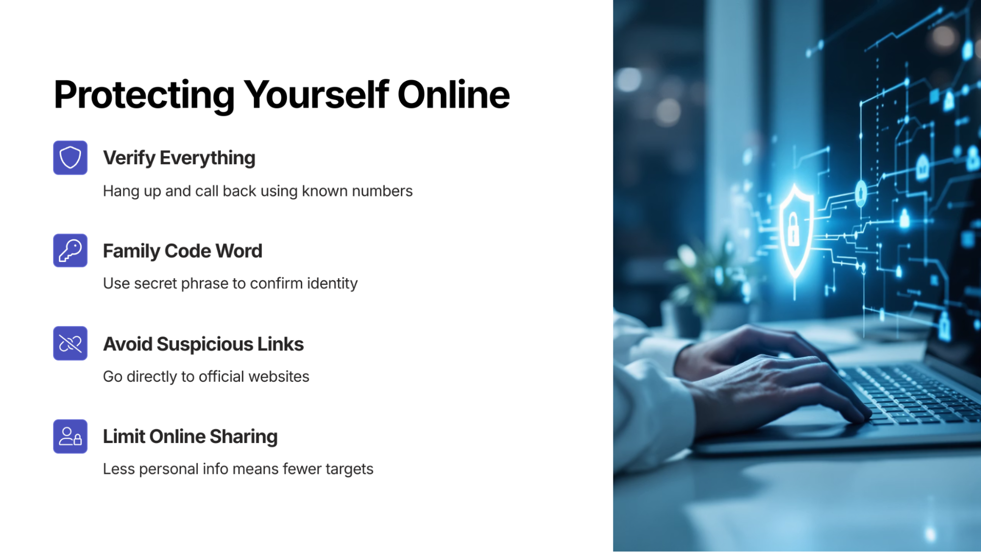 Limit what you share online. The less personal info you post, the harder it is for scammers to target you.