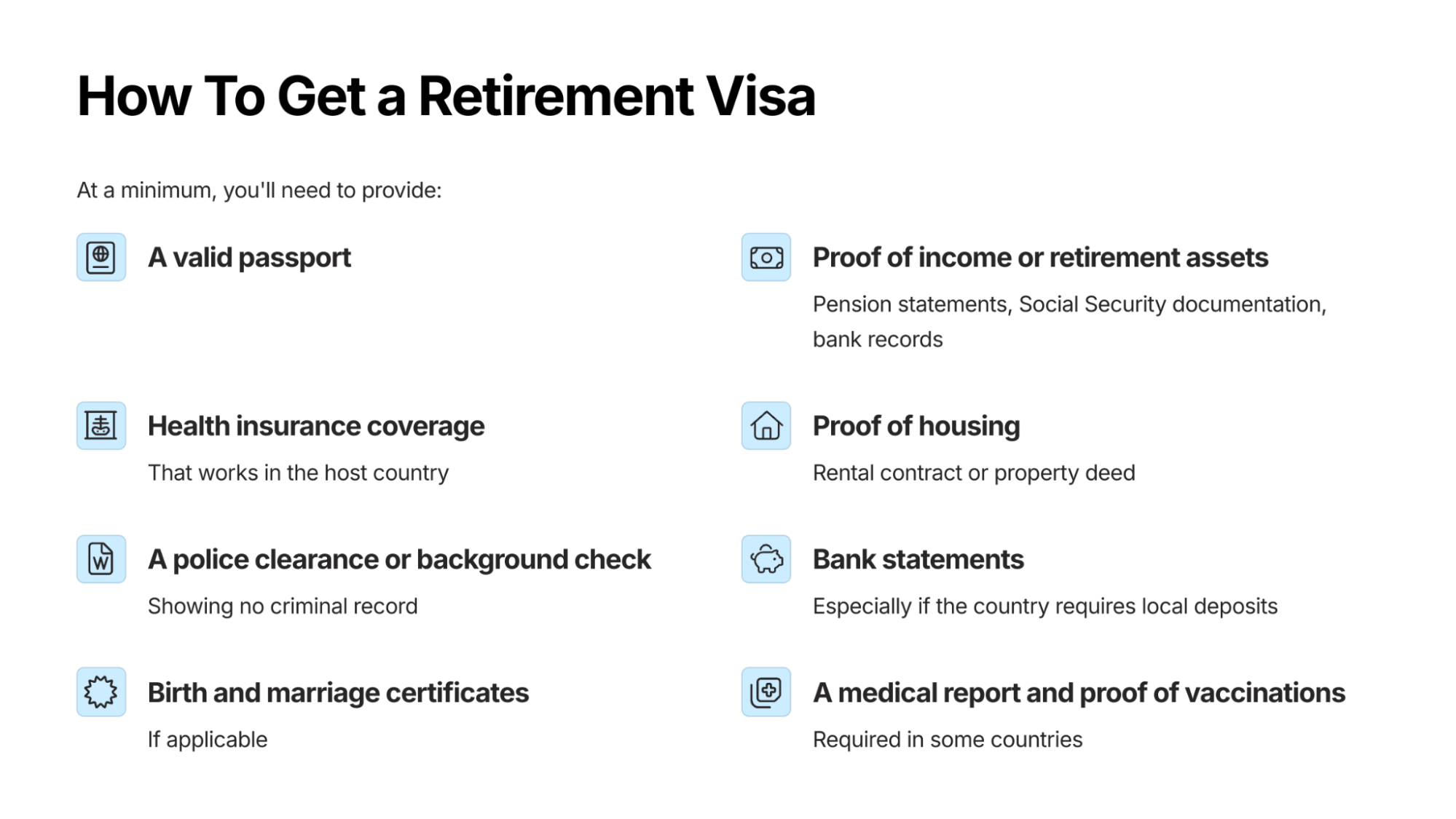 Some countries will also ask for additional documentation such as a notarized letter confirming your retirement status or a financial affidavit.